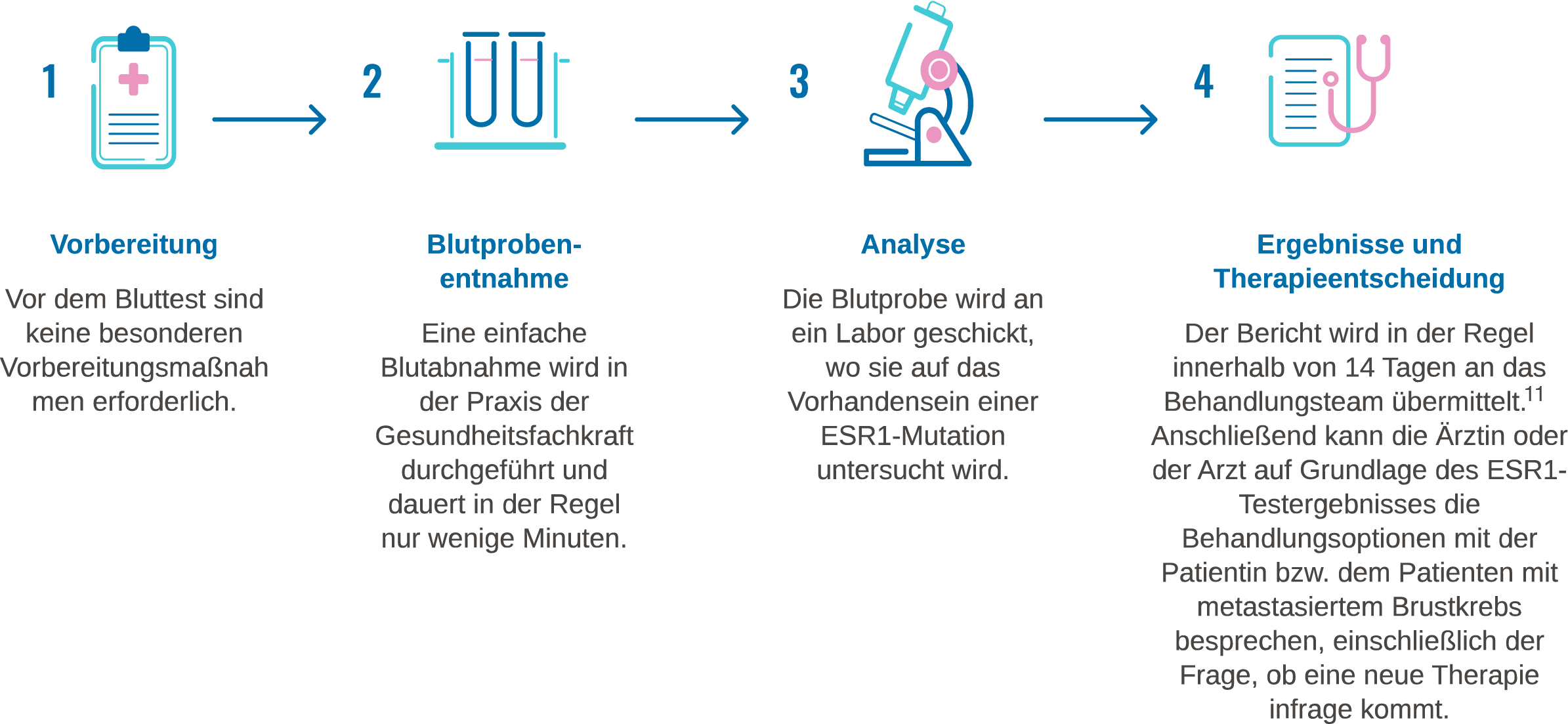 Da ESR1-Mutationen infolge einer vorherigen Behandlung mit endokriner Therapie bei fortgeschrittenem Brustkrebs auftreten können,2 sollte bei jedem Fortschreiten der Erkrankung ein Test auf ESR1-Mutationen durchgeführt werden, sofern diese zuvor nicht nachgewiesen wurden.3,4